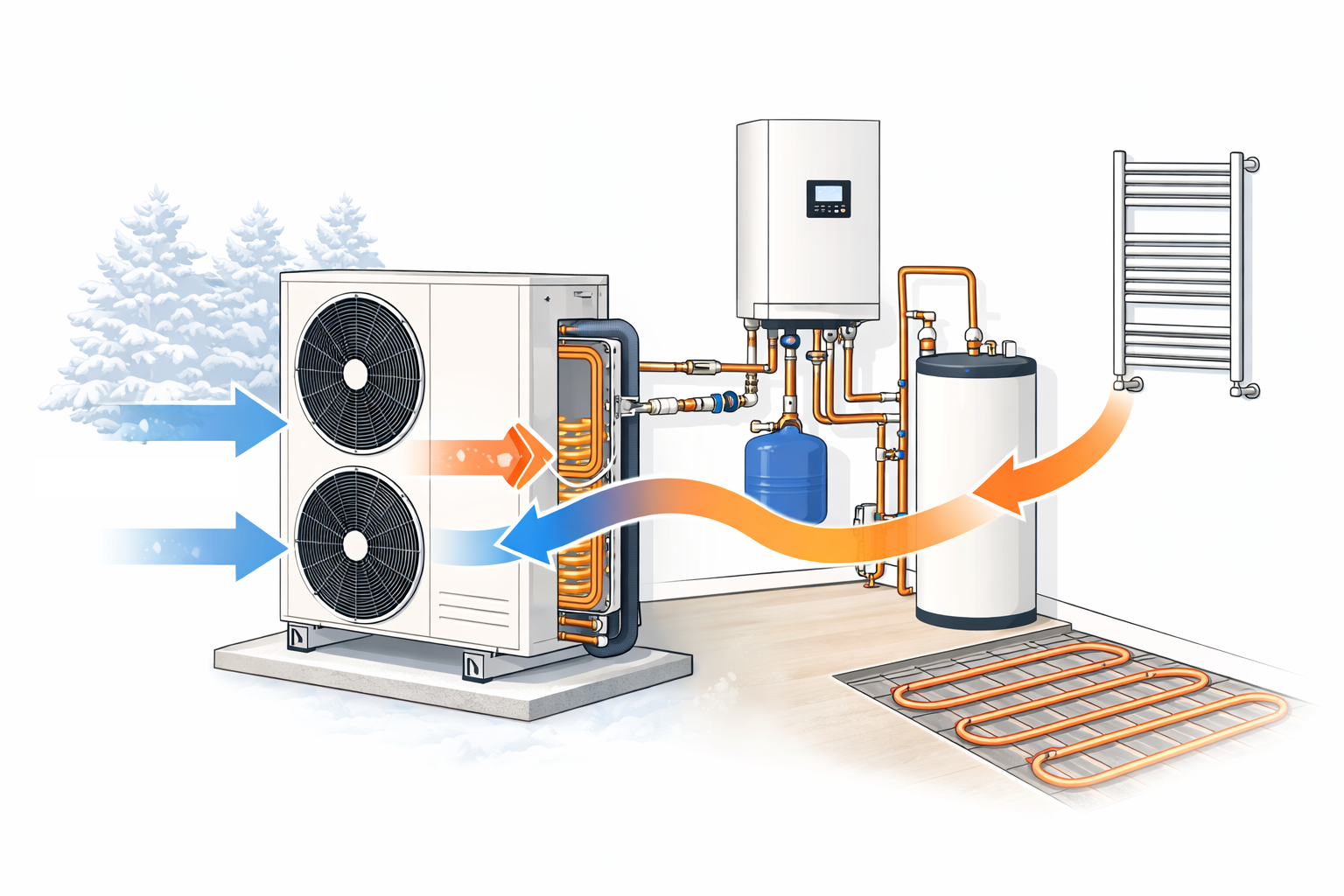 Concrètement, l’air au dehors est aspiré par l’unité extérieure, où un fluide frigorigène récupère les calories et s’évapore. Ce fluide est ensuite compressé, ce qui augmente fortement sa température. La chaleur produite est alors transmise à l’eau du système de chauffage (radiateurs, plancher chauffant ou ballon d’eau chaude) via un échangeur. Une fois la chaleur restituée, le fluide se détend et recommence un nouveau cycle.